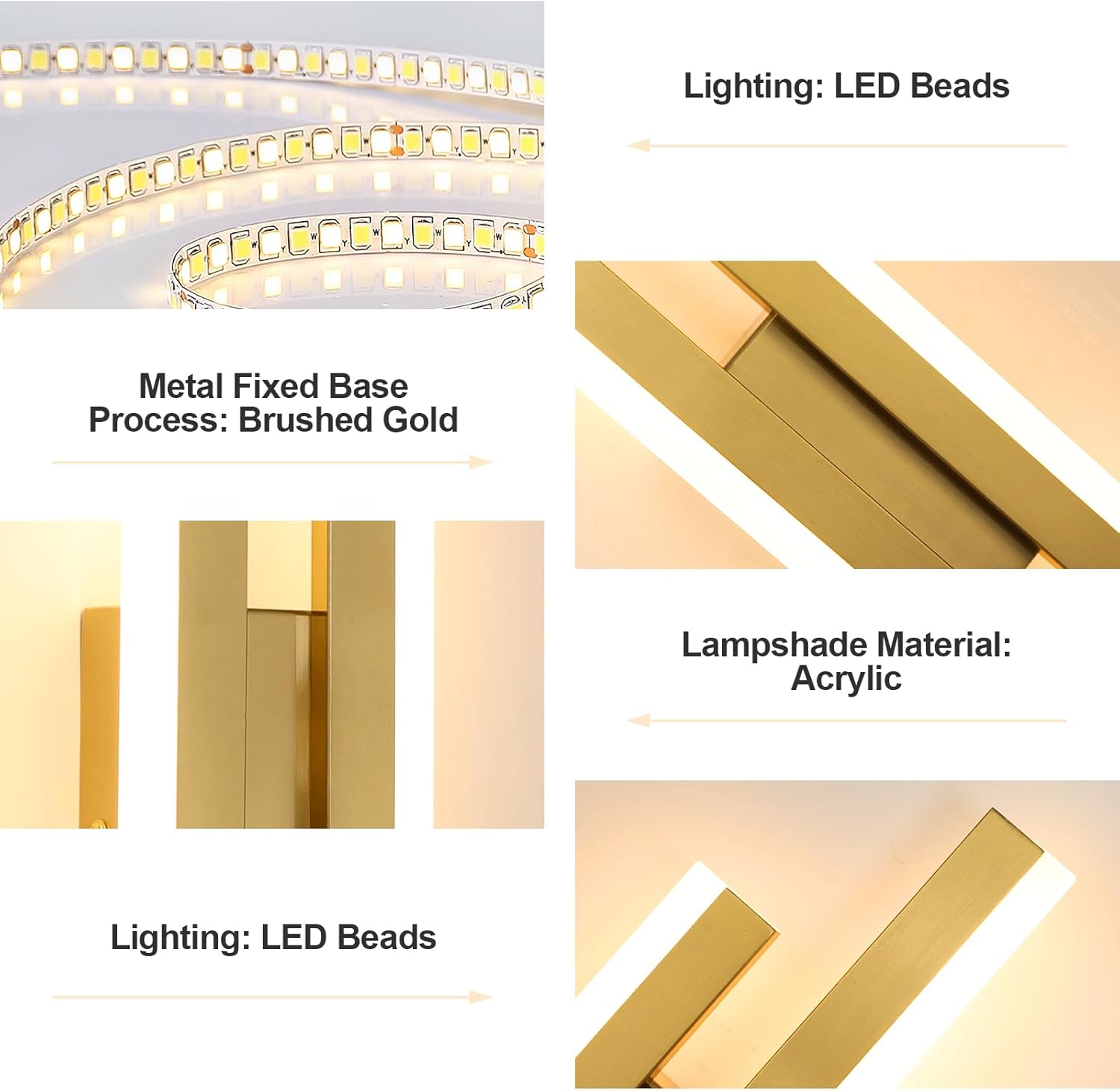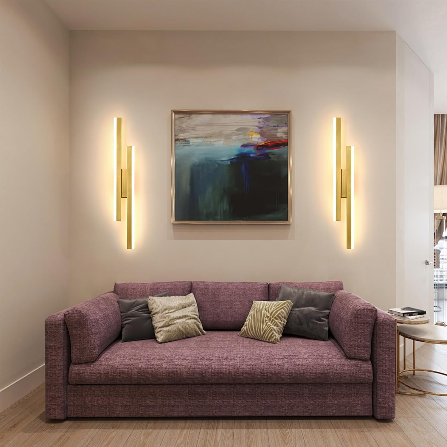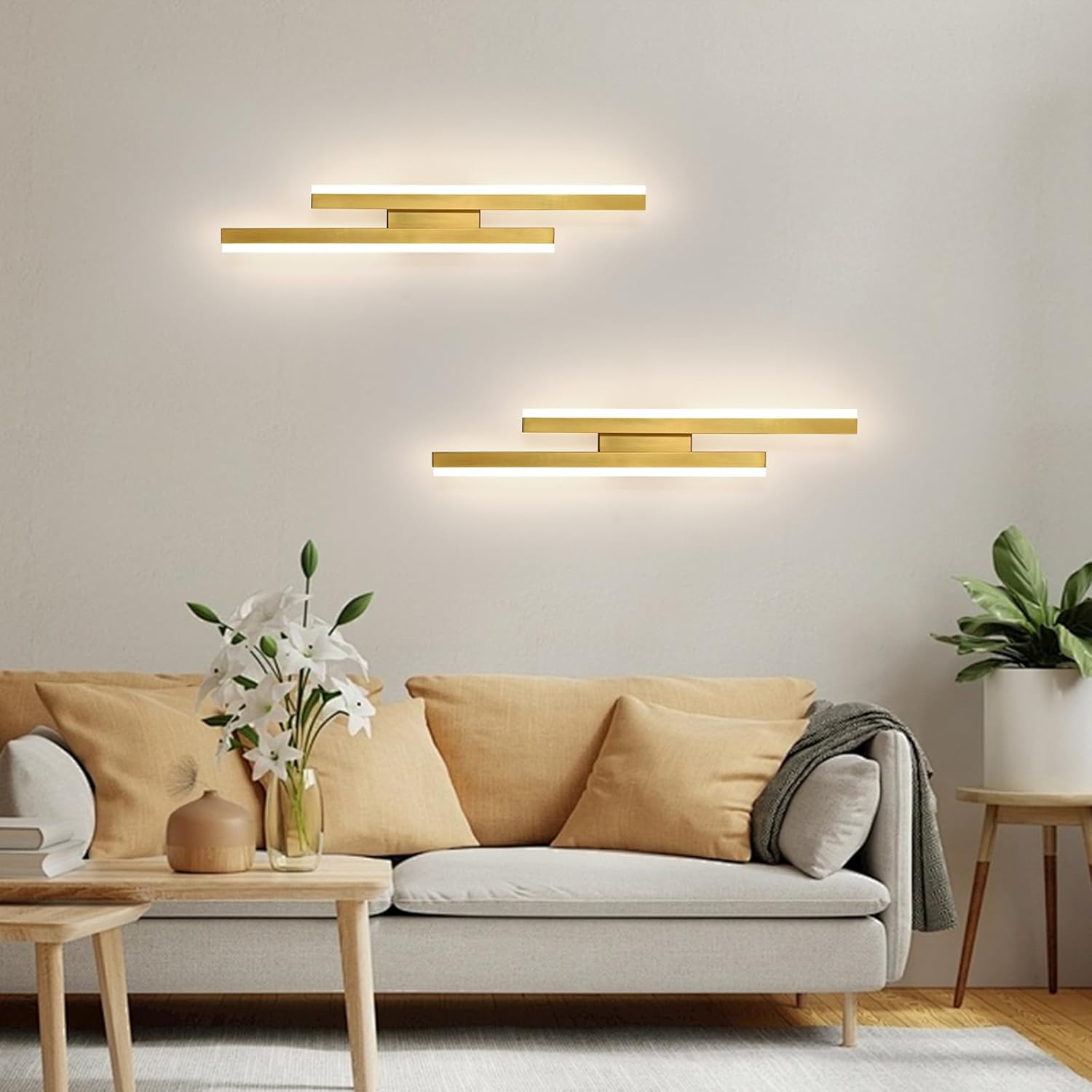 Diseño minimalista con dos columnas de luz desplazadas que crean una estética asimétrica. El acabado dorado aporta una sensación cálida y lujosa.