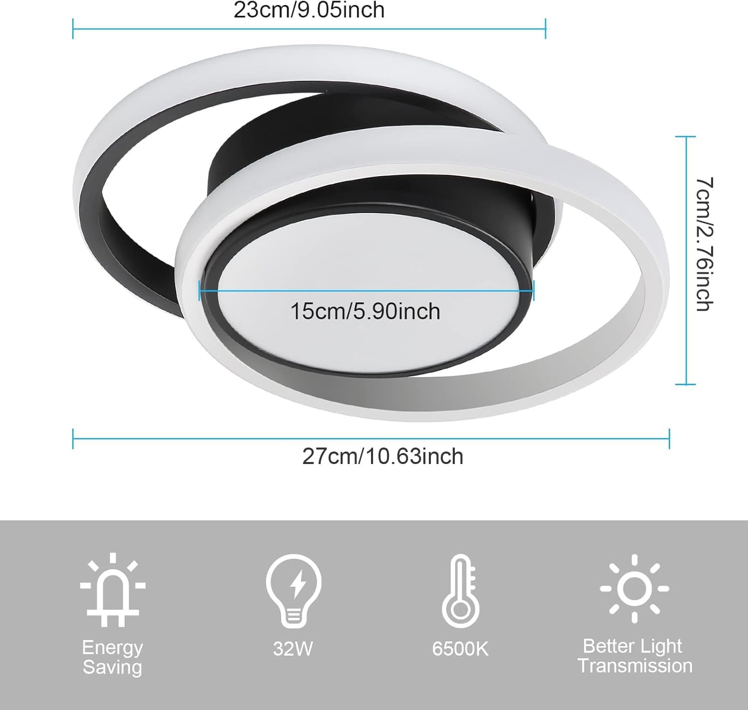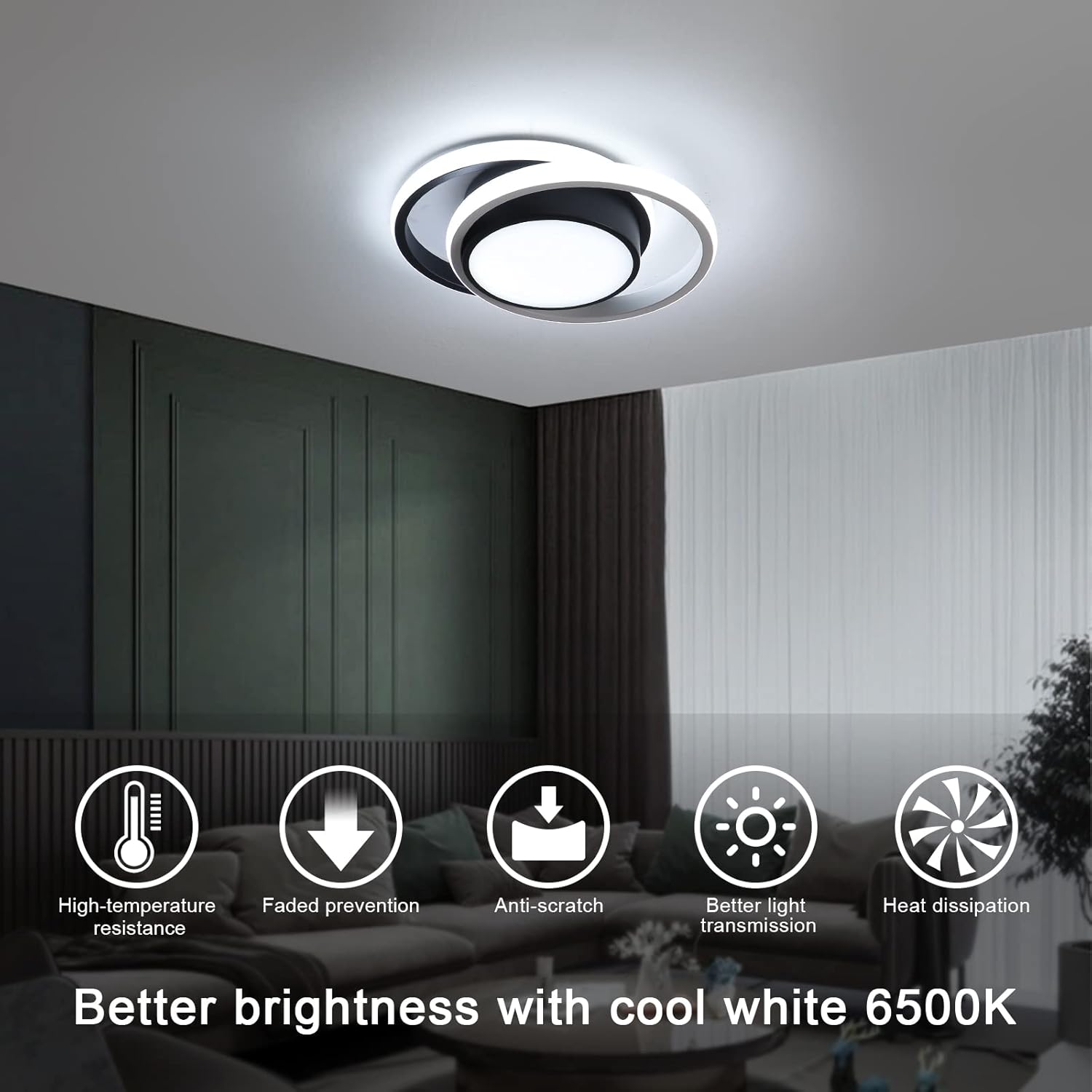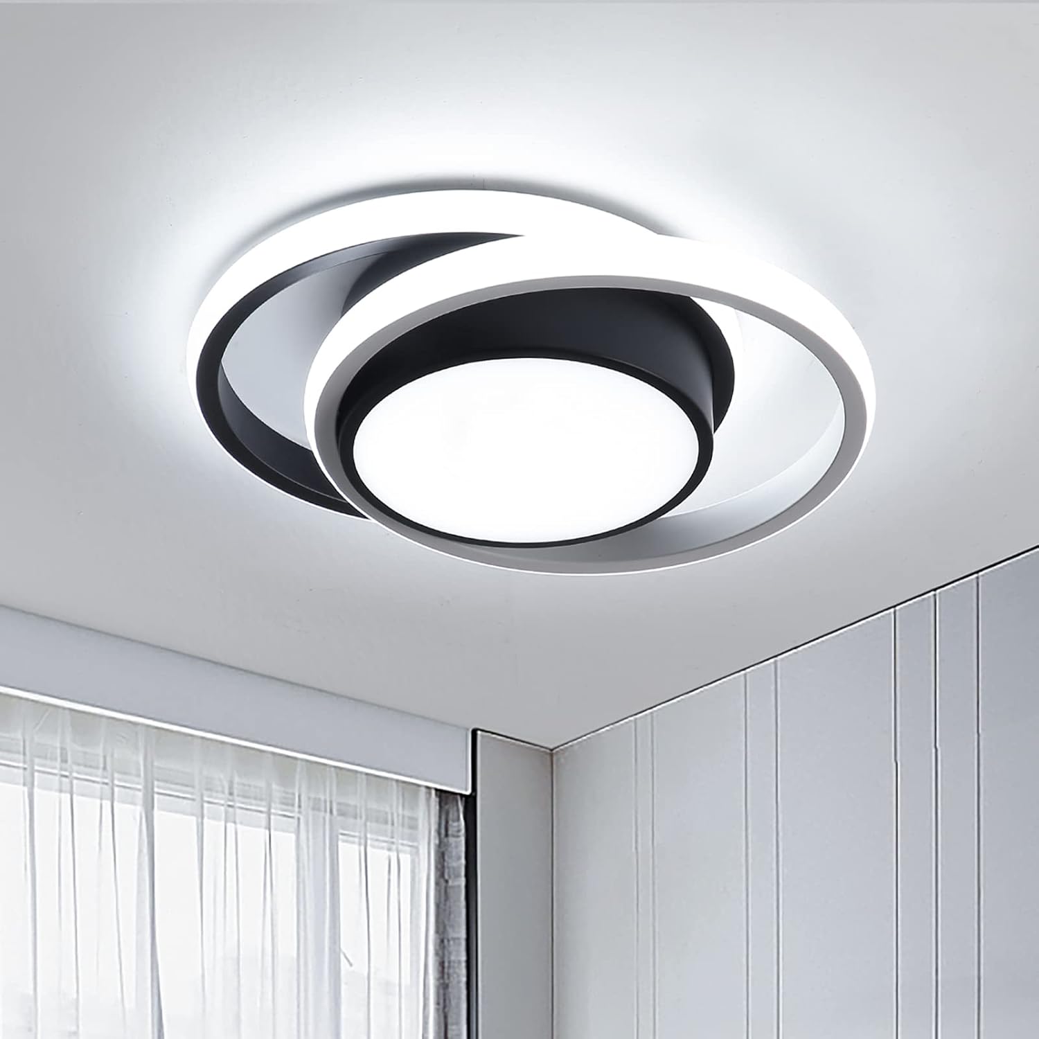 Deze LED plafondlamp heeft een overlappend dubbel cirkelontwerp in zwart en wit. Het strakke geometrische ontwerp past perfect in moderne woonruimtes.